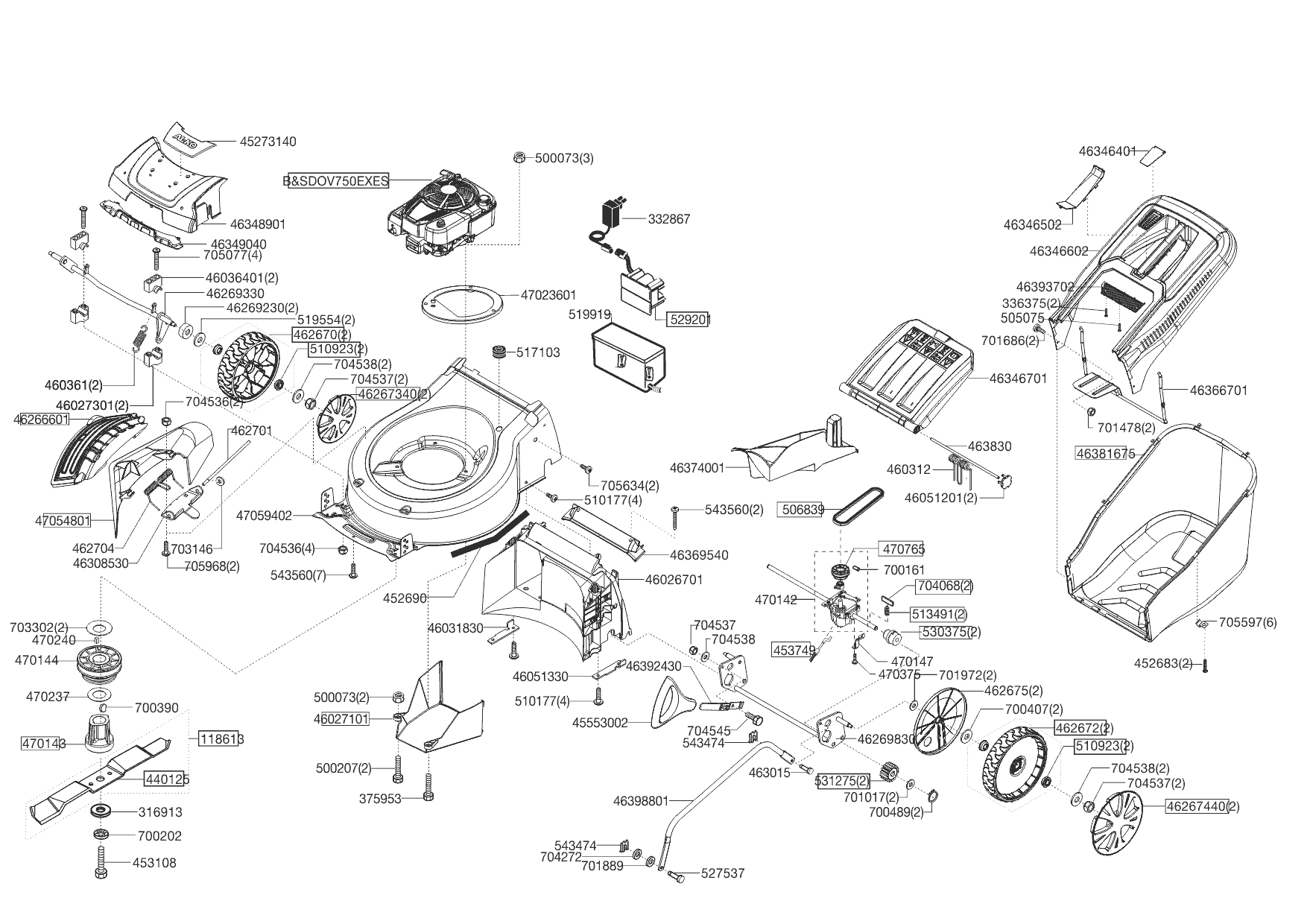 Zeichnungen von Powerline Benzinrasenmäher 4704 VSE Selection 12/2013 - 03/2015 mit der Geräte-Artikelnr. 119531: