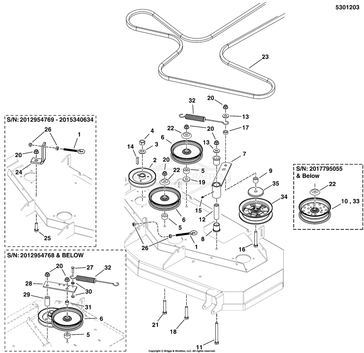 Hier finden Sie alle Ersatzteile von Snapper 5901275 - 400ZB2448, 48" 24 HP ZTR 400Z Series der Zeichnungsgruppe 48" Mower Deck Group - Pulleys, Belts & Idler Arm: