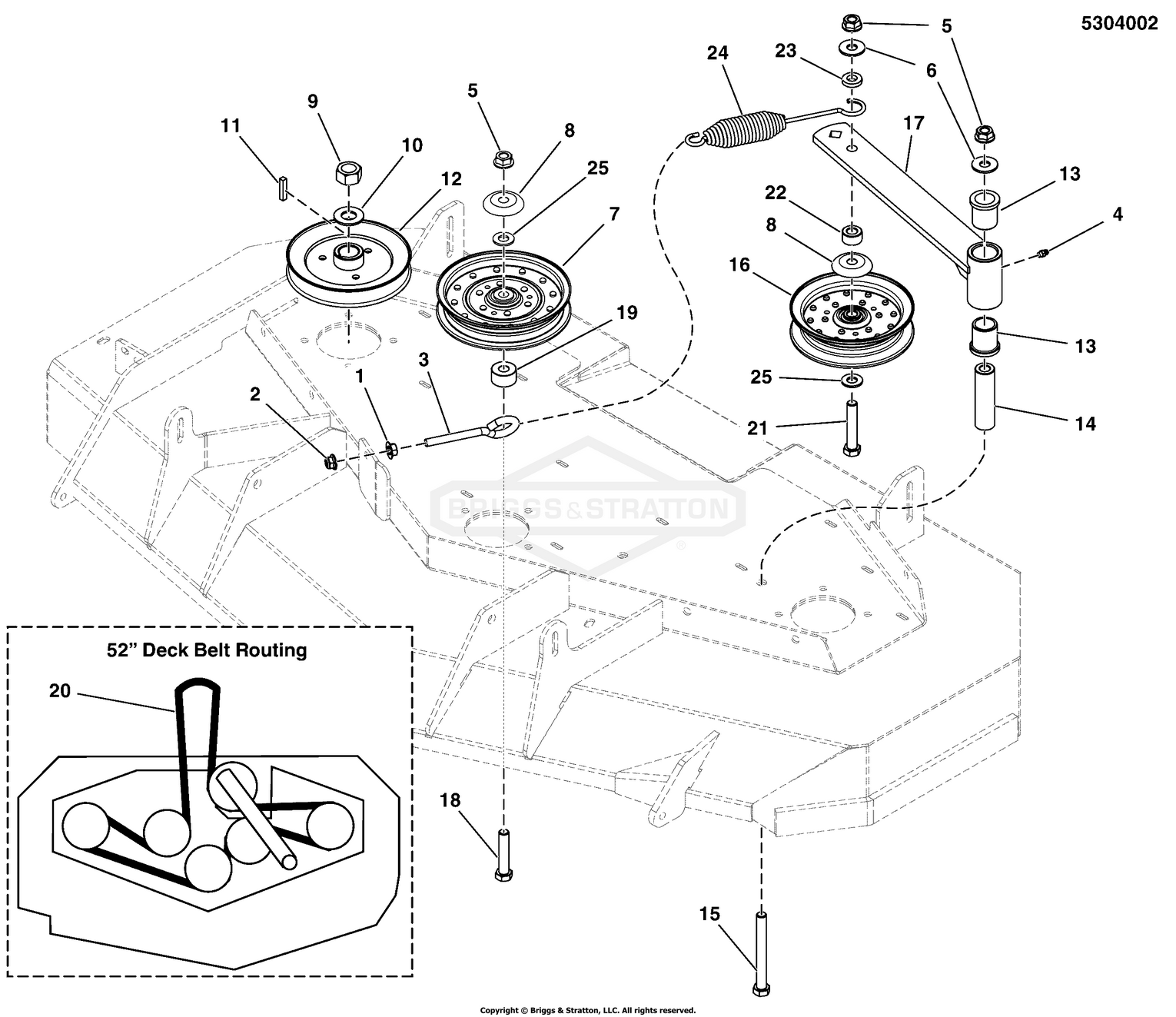 Zeichnung Snapper 5901400 - 550ZKAV2452, 52" 24HP ZTR 550Z Series - Zeichnungsgruppe 52" Mower Deck Group - Pulleys, Belt & Idler Arm:
