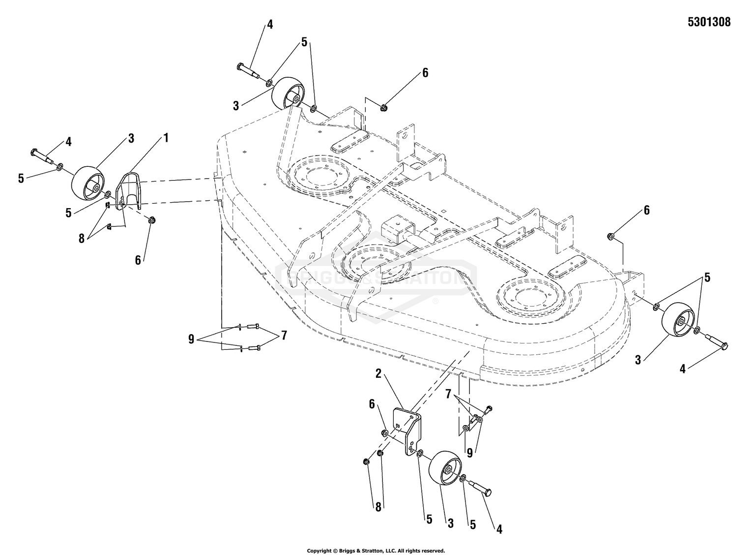 Hier finden Sie alle Ersatzteile von Snapper 5900748 - 355ZB2654, 54" 26 HP ZTR 355Z Series der Zeichnungsgruppe 54" Mower Deck - Rollers & Casters Group: