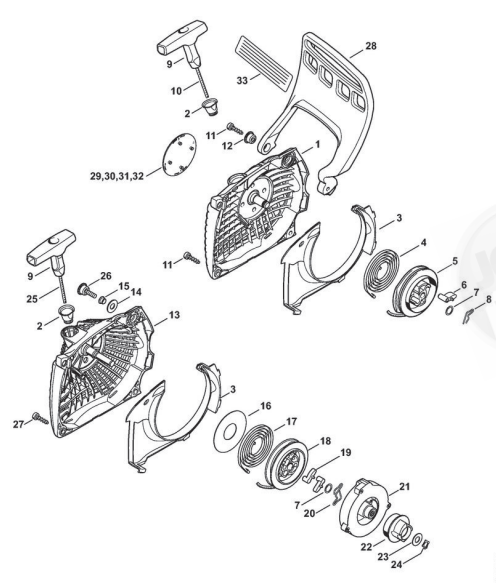 Hier finden Sie alle Ersatzteile von Stihl Benzin-Motorsägen MS 291 C-BE der Zeichnungsgruppe Anwerfvorrichtung, Handschutz: