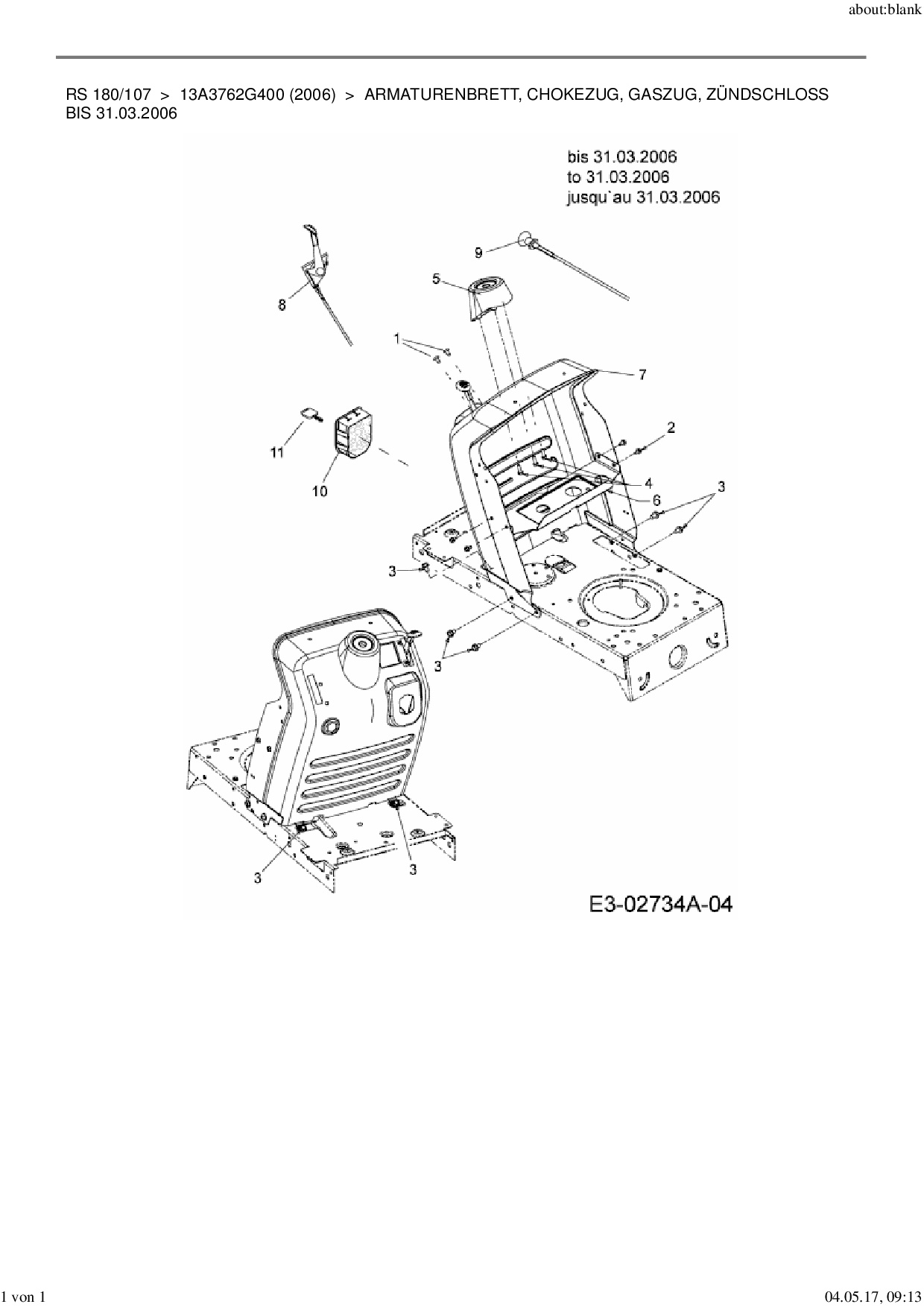 Download Ersatzteil-Zeichnung MTD RS 180/107 Zeichnung Armaturenbrett, Chokezug, Gaszug, Zündschloss bis 31.03.2006 (PDF-Format)