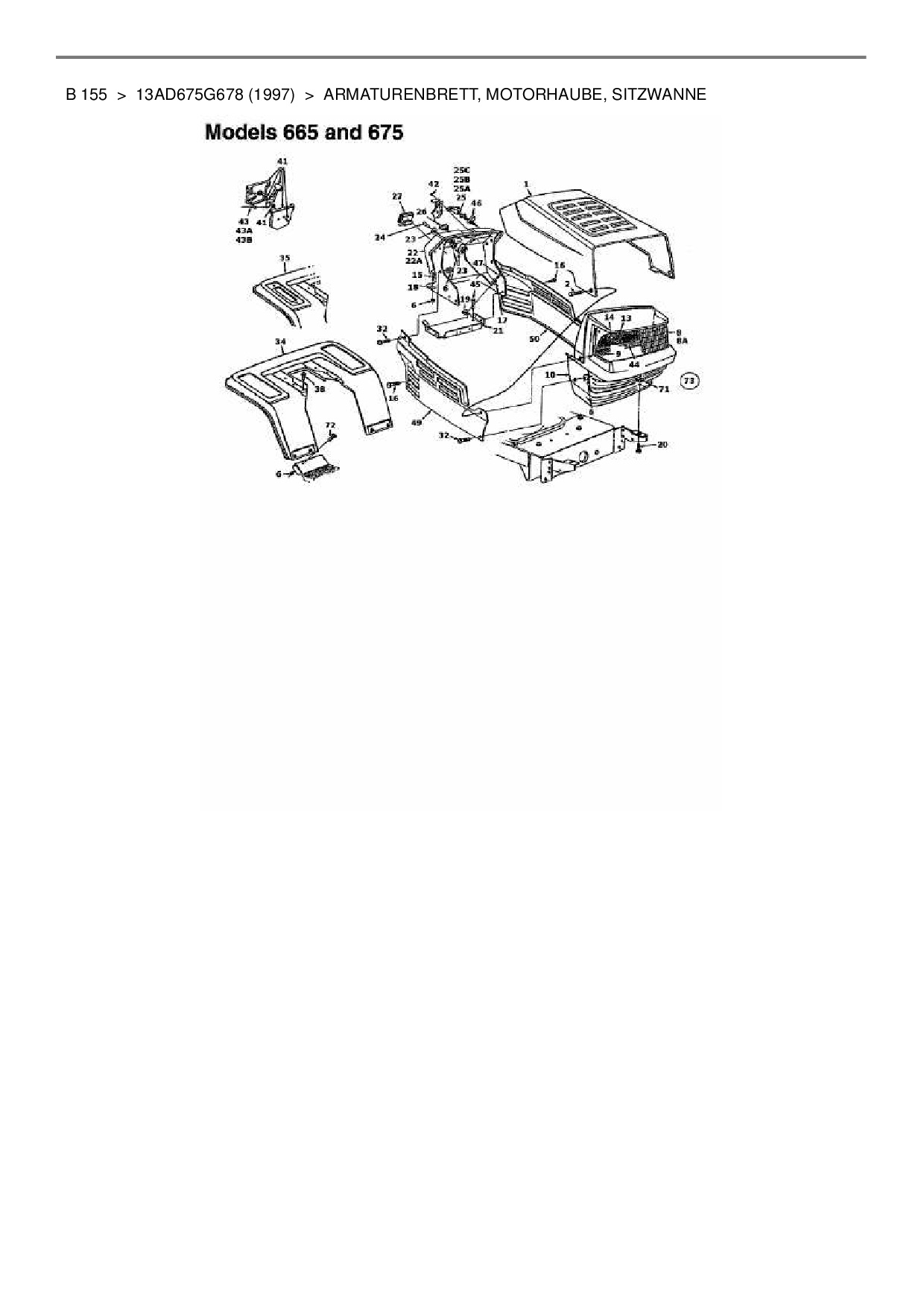 Ersatzteile für Rasentraktor MTD B 155 aus der Zeichnung Armaturenbrett, Motorhaube, Sitzwanne: