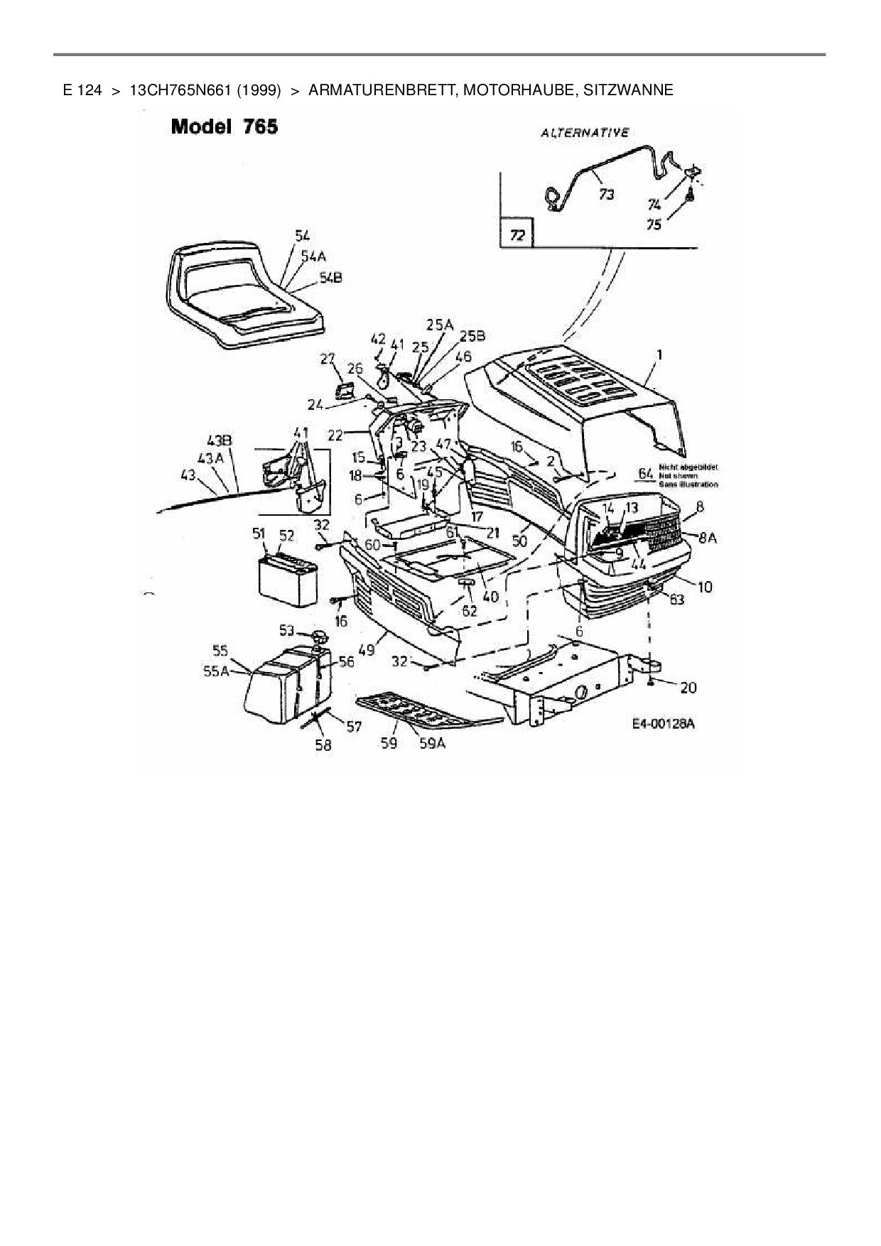 Ersatzteile für Rasentraktor MTD E 124 aus der Zeichnung Armaturenbrett, Motorhaube, Sitzwanne: