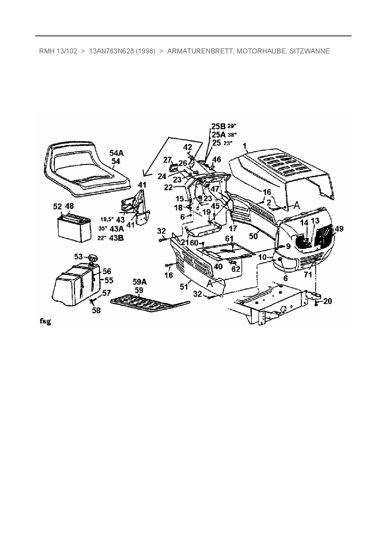 Ersatzteile für Rasentraktor Raiffeisen RMH 13/102 aus der Zeichnung Armaturenbrett, Motorhaube, Sitzwanne: