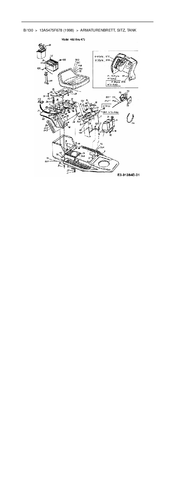 Ersatzteile für Rasentraktor MTD B/130 aus der Zeichnung Armaturenbrett, Sitz, Tank: