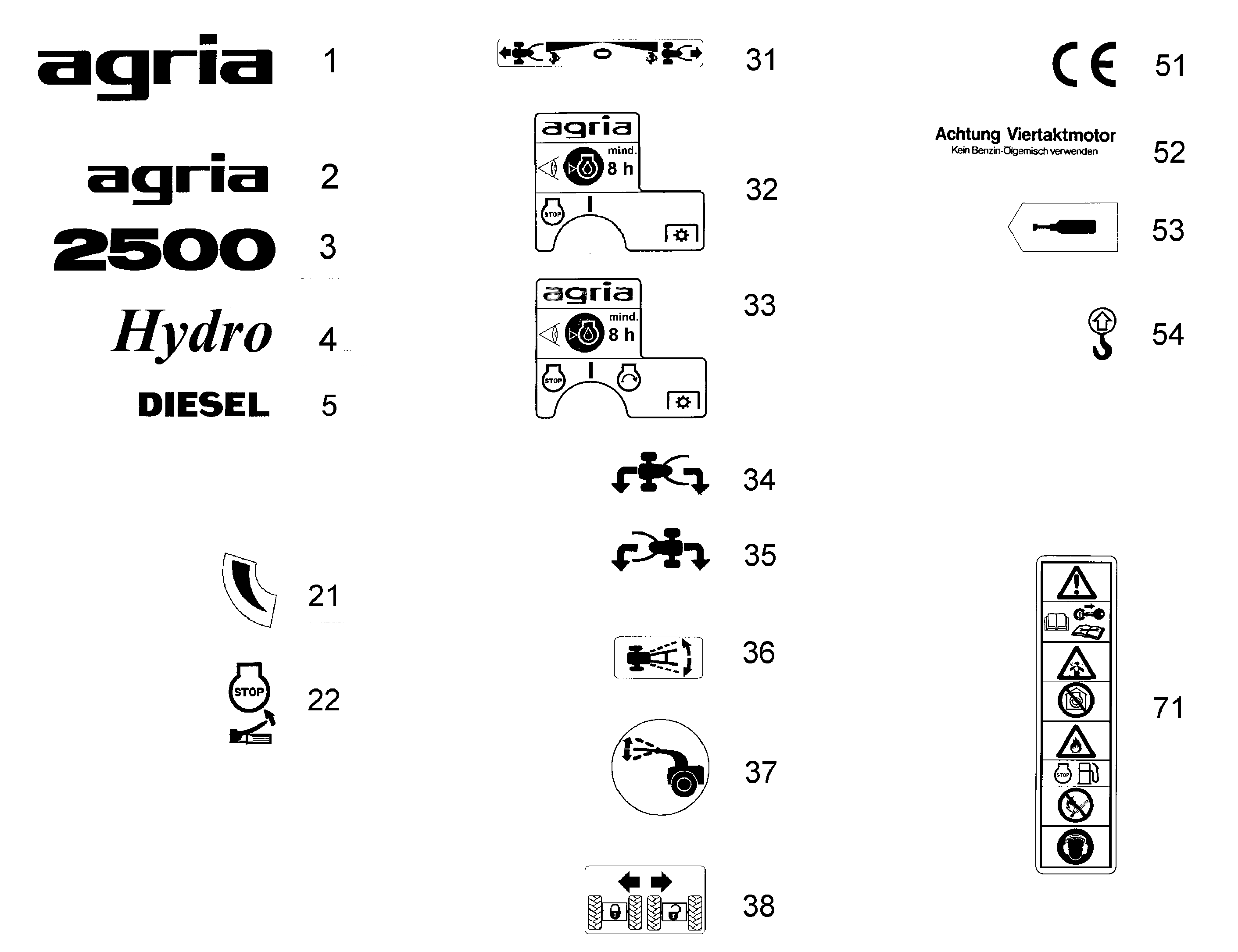 Folgende Ersatzteile für Agria # Einachser # agria 2500 # Art-Nr 2500221 | agria 2500 Hydro E-Start # Werkzeug, Aufkleber, Schmierstoffe, Lacke # Aufkleber | 2500 211, 2500 221 können Sie hier bestellen: