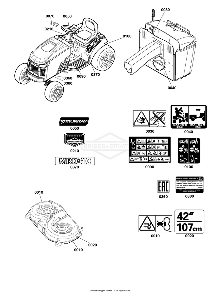 Hier finden Sie alle Ersatzteile von Murray Aufsitzmäher 2691717-00 - MRD310, 8270 107cm Murray Rear Discharge Lawn Tractor (CE/Export) (2020) der Zeichnungsgruppe Aufkleber: