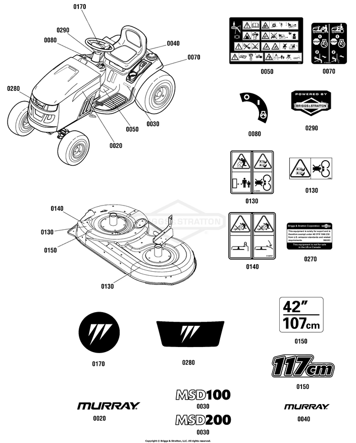 Hier finden Sie alle Ersatzteile von Murray Aufsitzmäher 2691220-01 - MSD100, 17.5 Gross HP 42" Murray Lawn Tractor (Export) (2015) der Zeichnungsgruppe Aufkleber: