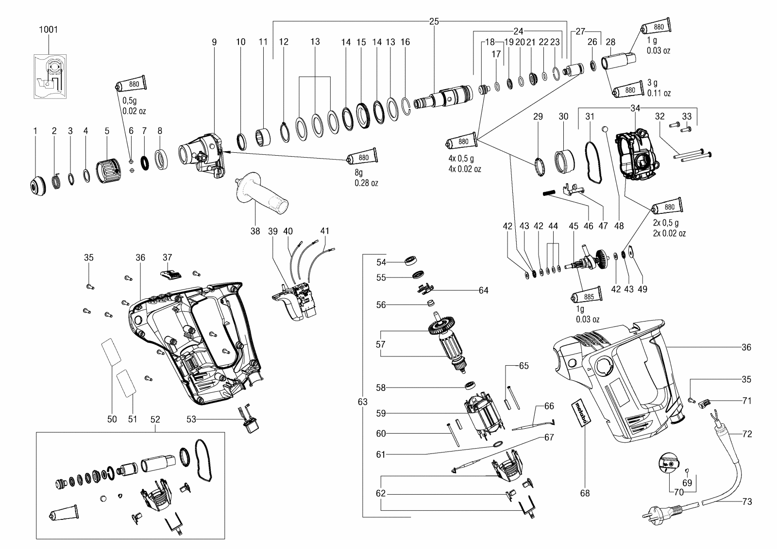 Zeichnung 1 Sollten Sie Fragen zu einem Ersatzteil von Metabo BHE 20 Compact Bohrhammer 600402000 600402000 haben, können Sie uns gerne eine E-Mail (mit einem Foto vom Typenschild Ihres Gerätes) schreiben oder eine Ersatzteilanfrage stellen.