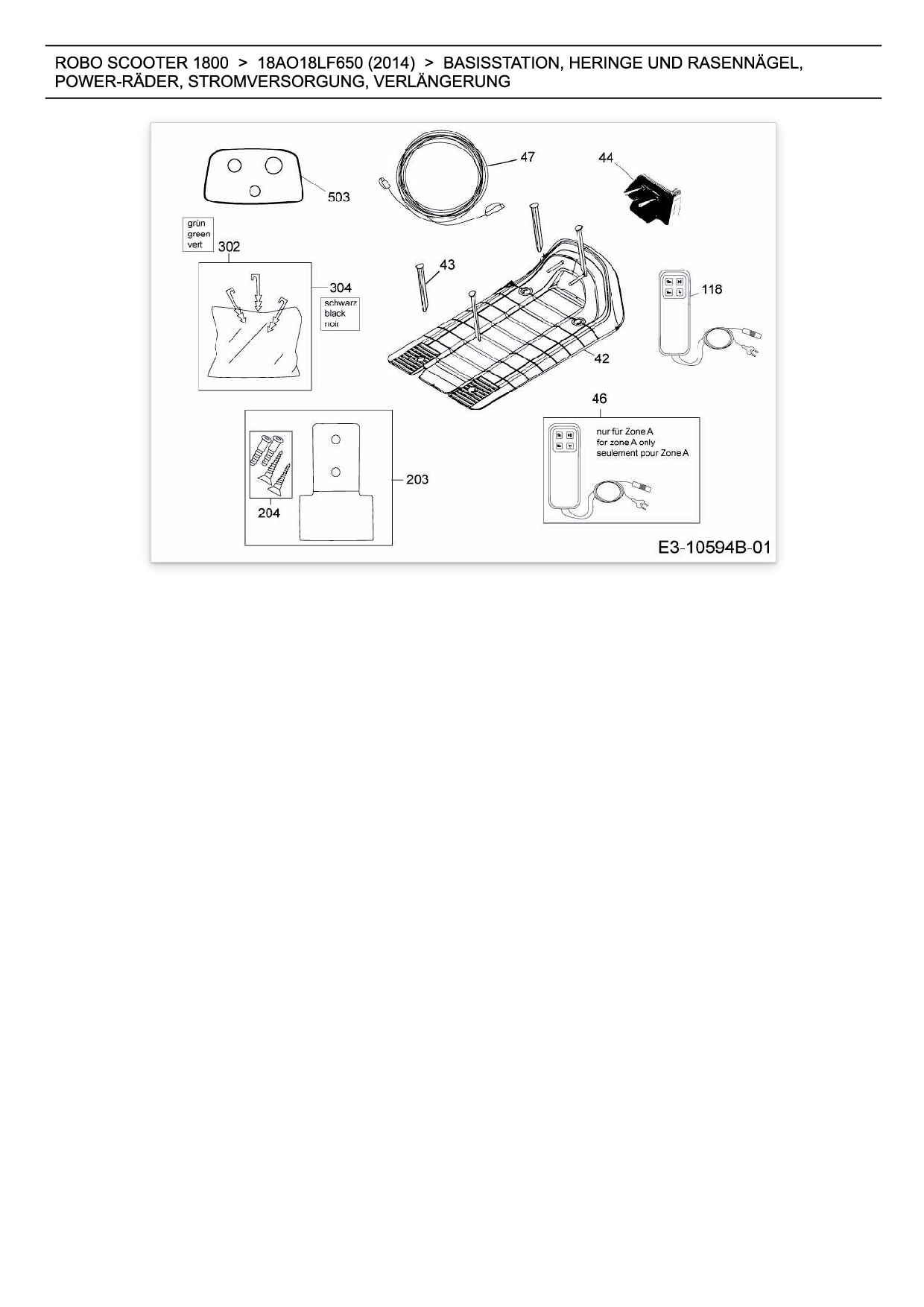 Ersatzteile für Mähroboter Wolf-Garten Expert ROBO SCOOTER 1800 aus der Zeichnung Basisstation, Heringe und Rasennägel, Power-Räder, Stromversorgung, Verlängerung: