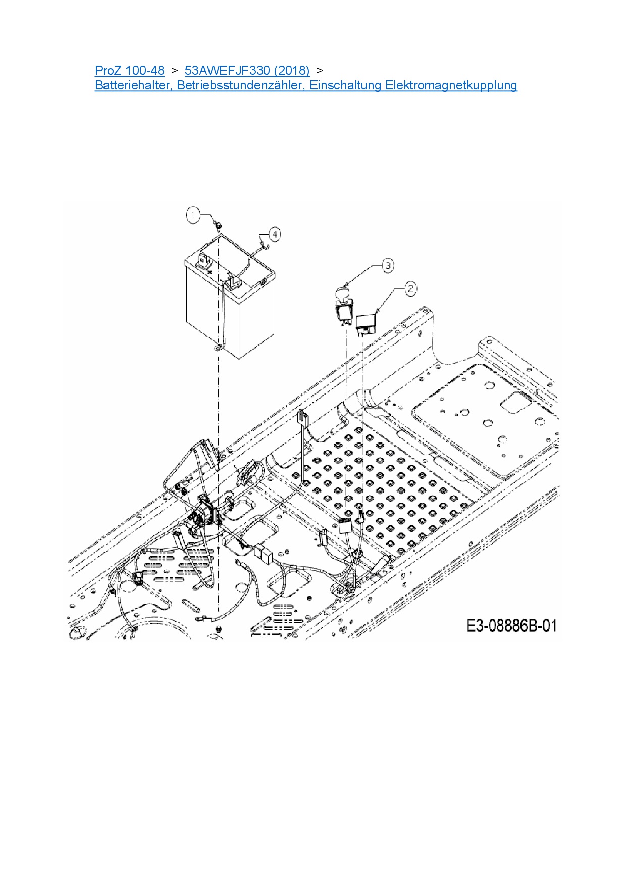 Ersatzteile für Zero Turn Cub Cadet ProZ 100-48 aus der Zeichnung Batteriehalter, Betriebsstundenzähler, Einschaltung Elektromagnetkupplung: