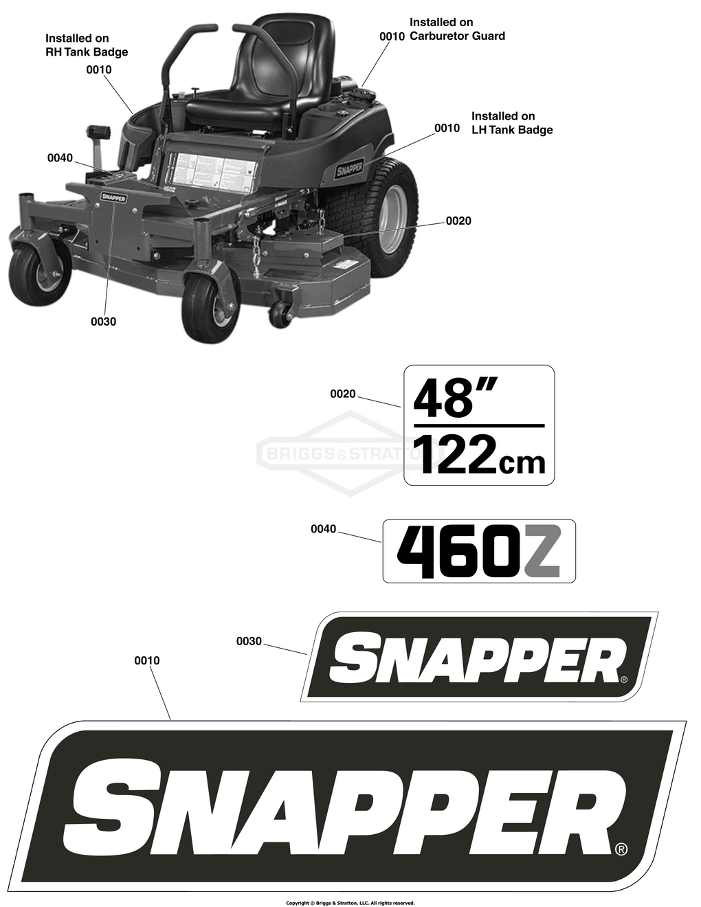 Hier finden Sie alle Ersatzteile von Snapper 5901718 - (ZT, 48" FAB, 25 B&S, SNP, 460Z 49 ST) 48" (122 cm), 460Z Series der Zeichnungsgruppe Decal Group - Brand & Model: