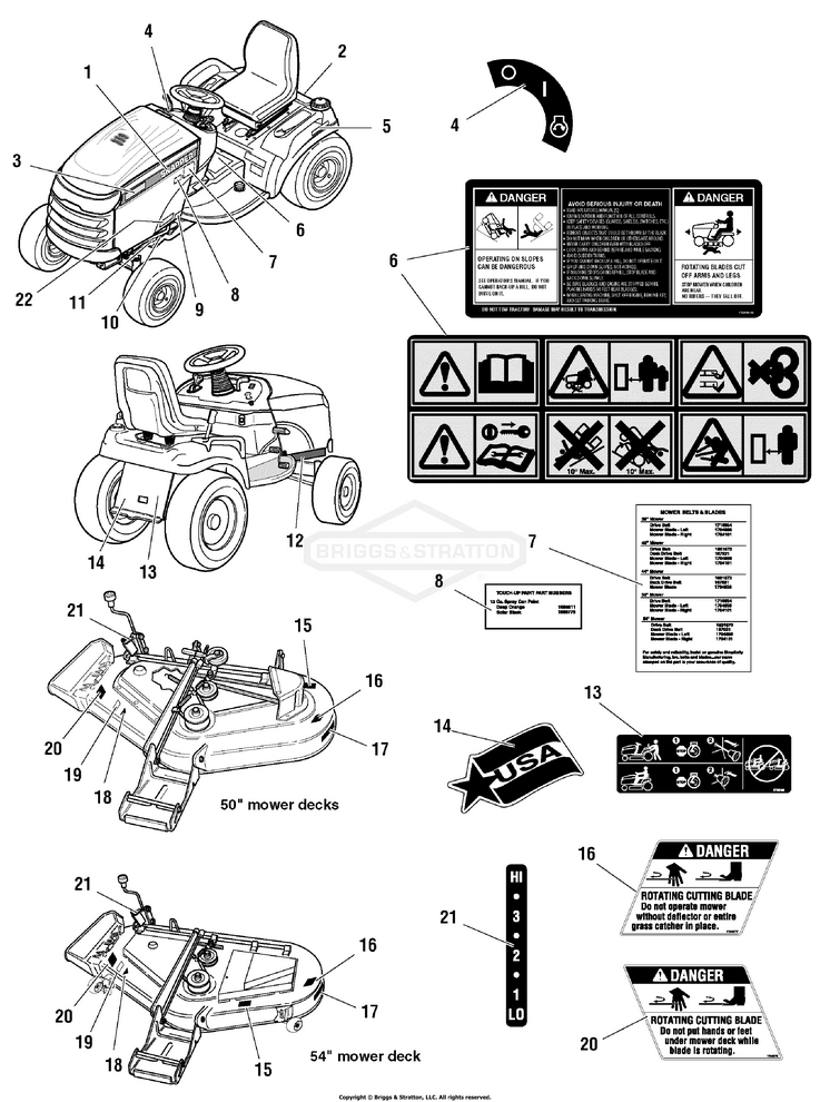 Hier finden Sie alle Ersatzteile von Snapper 1694621 - GT2354, 54" 23 HP Hydro Drive Garden Tractor der Zeichnungsgruppe Decals Group: