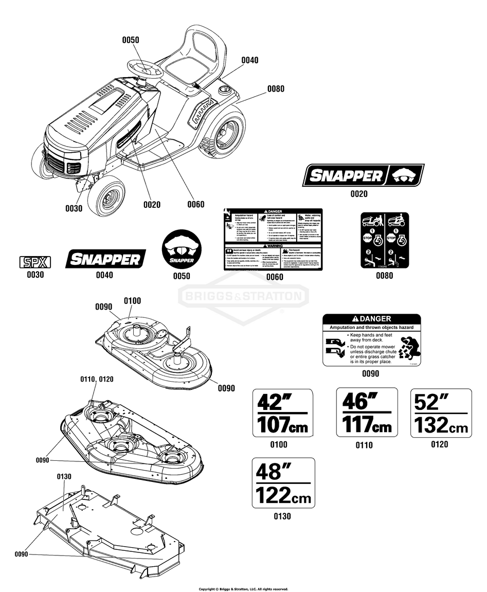 Hier finden Sie alle Ersatzteile von Snapper 2691346-01 - SPX2548, 48" 25 HP SPX Lawn Tractor 150 Series der Zeichnungsgruppe Decals Group: