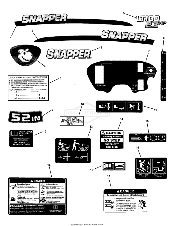 Zeichnung Snapper 7800318 - SLT24520FC, 52" 24HP Lawn Tractor LT100 Series aus der Zeichnungsgruppe Decals: