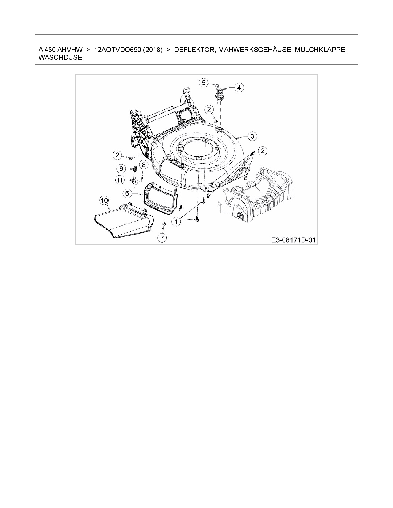 Download Ersatzteil-Zeichnung Wolf-Garten A 460 AHVHW Zeichnung Deflektor, Mähwerksgehäuse, Mulchklappe, Waschdüse (PDF-Format)