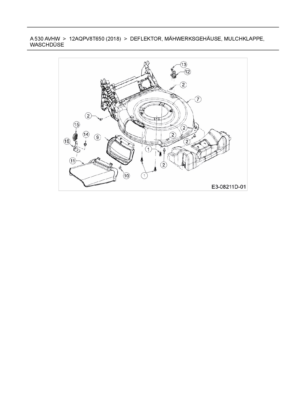 Ersatzteile für Motormäher mit Antrieb Wolf-Garten A 530 AVHW aus der Zeichnung Deflektor, Mähwerksgehäuse, Mulchklappe, Waschdüse: