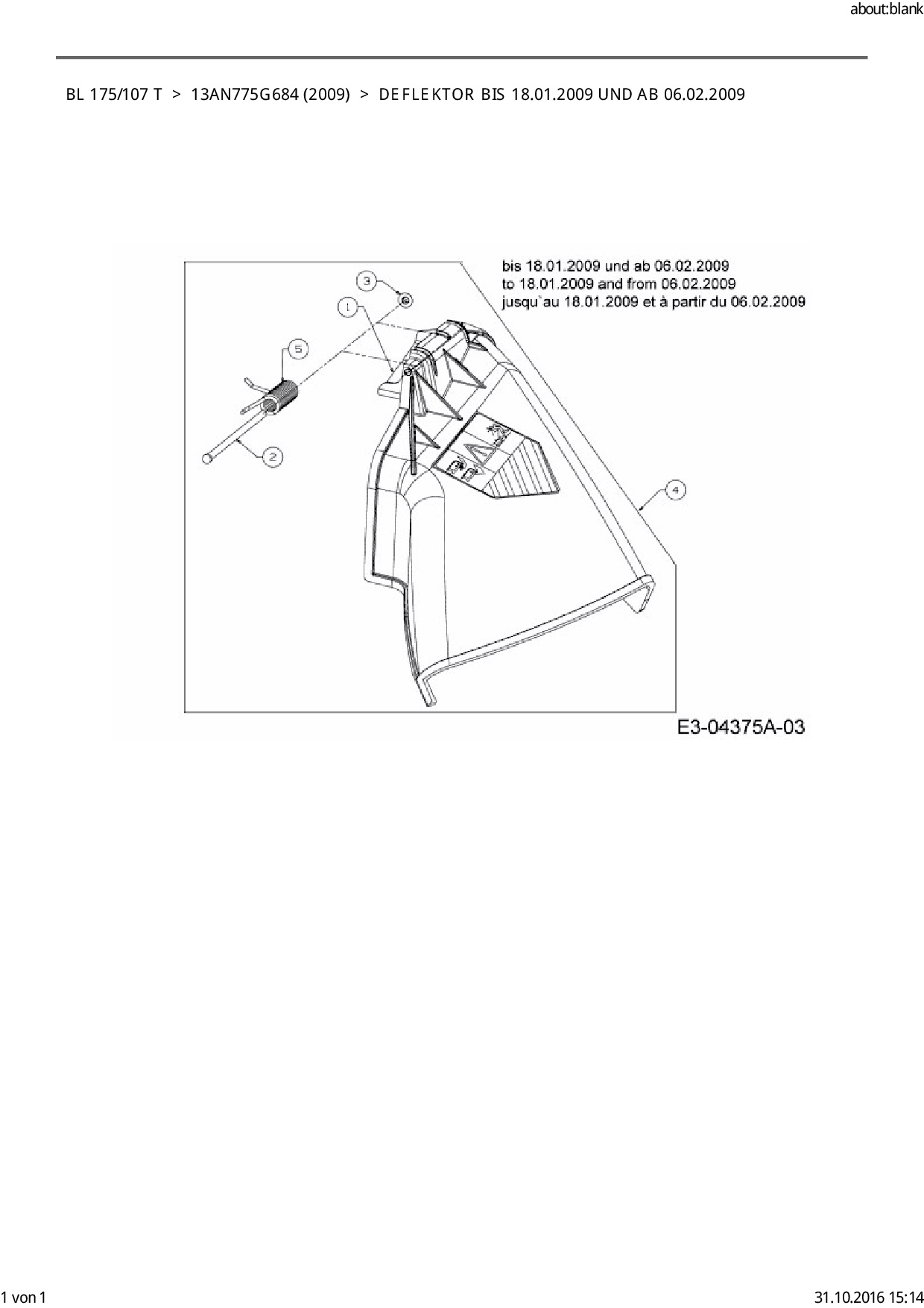 Ersatzteile für Rasentraktor Bolens BL 175/107 T aus der Zeichnung Deflektor bis 18.01.2009 und ab 06.02.2009: