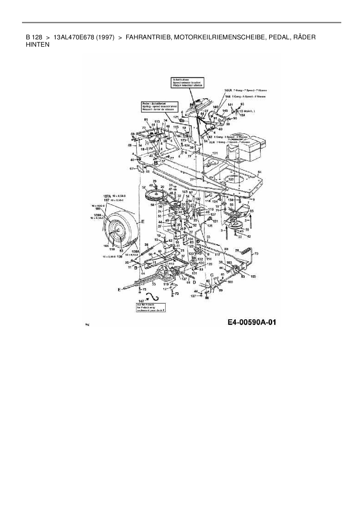 Ersatzteile für Rasentraktor MTD B 128 aus der Zeichnung Fahrantrieb, Motorkeilriemenscheibe, Pedal, Räder hinten: