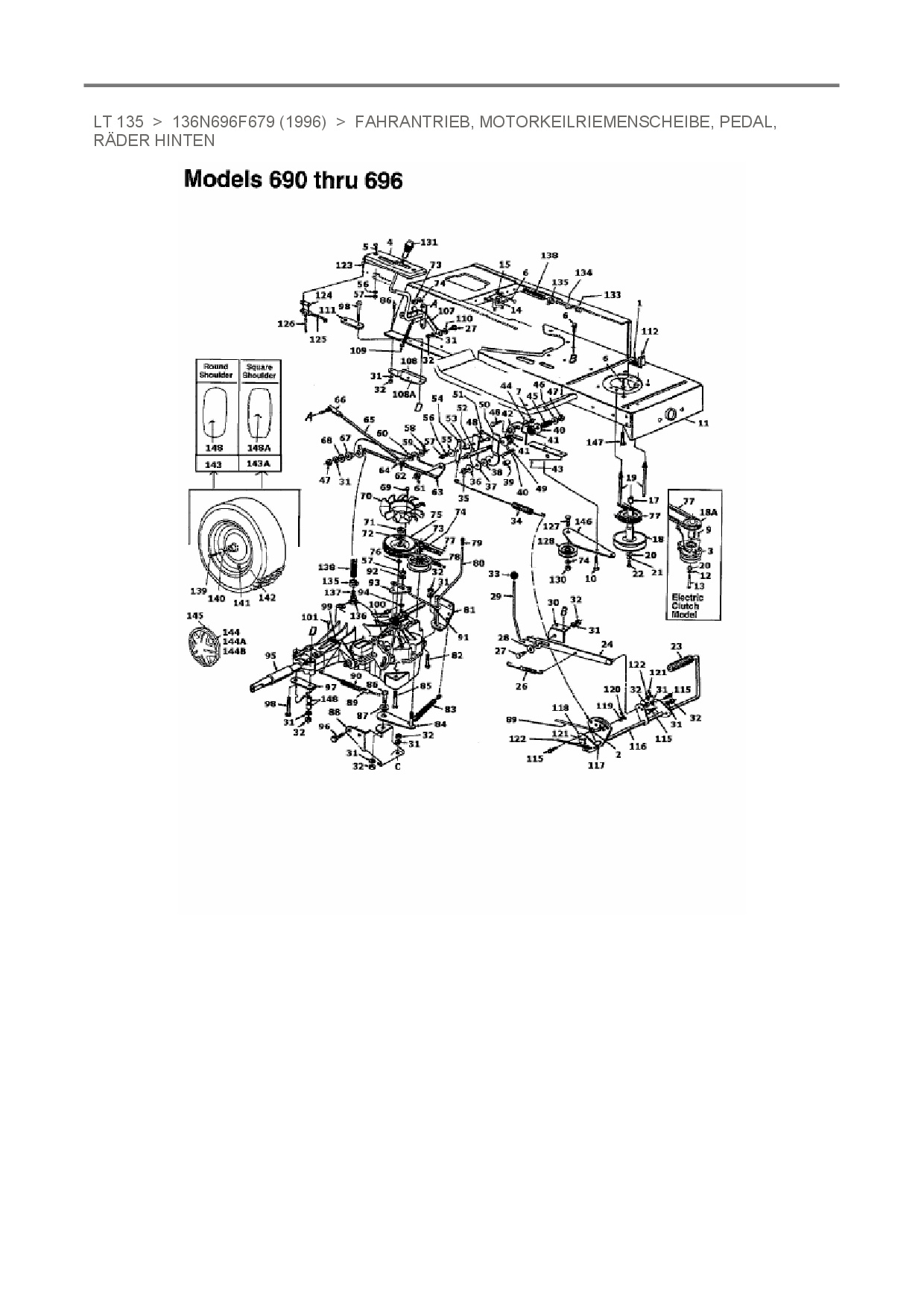 Ersatzteile für Rasentraktor White LT 135 aus der Zeichnung Fahrantrieb, Motorkeilriemenscheibe, Pedal, Räder hinten: