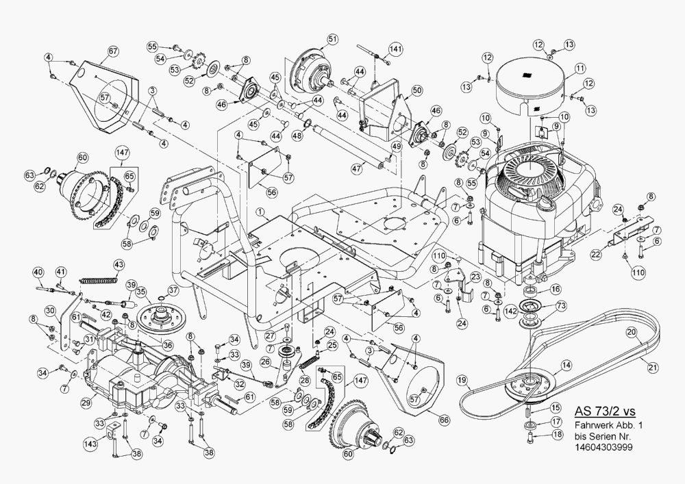 Hier finden Sie alle Ersatzteile von AS-Motor Allmäher AS 73 4T B&S und AS 73/2 vs ab FNr. 014603404001 aus dem Zeichnungsblatt Fahrwerk Abb. 1:
