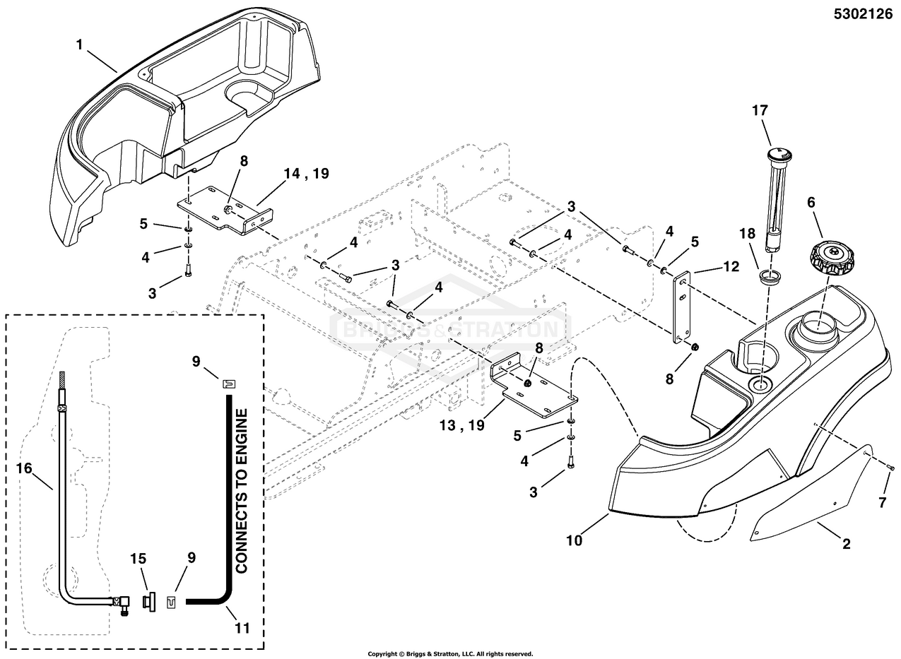 Zeichnung Snapper 5901275 - 400ZB2448, 48" 24 HP ZTR 400Z Series - Zeichnungsgruppe Fuel Tank & Mount Group - Single Tank: