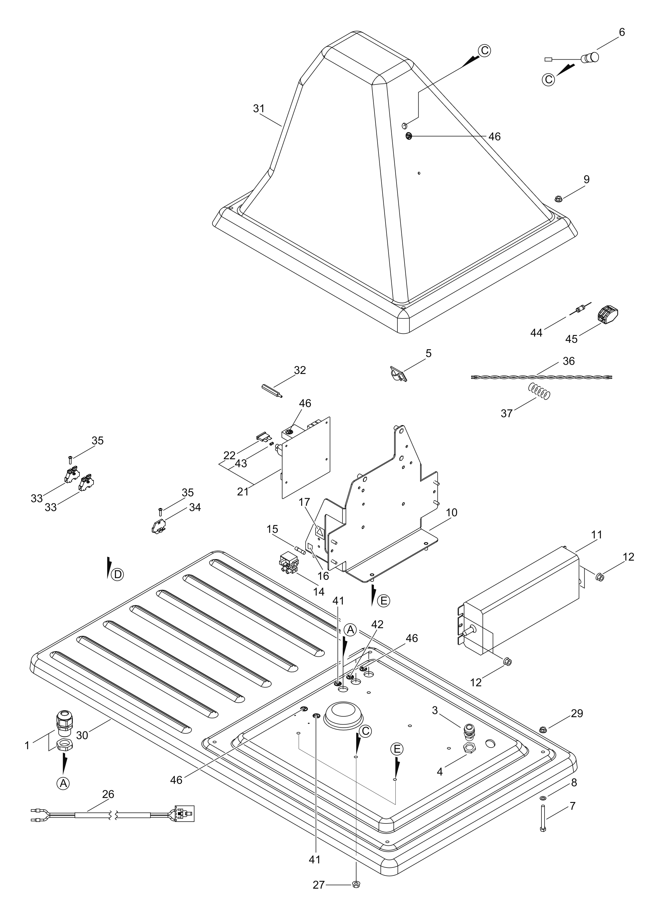 Hier finden Sie alle Ersatzteile von Echo Mähroboter Belrobotics Connected Loop Ladestation der Zeichnungsgruppe Gehäuse, Elektrik: