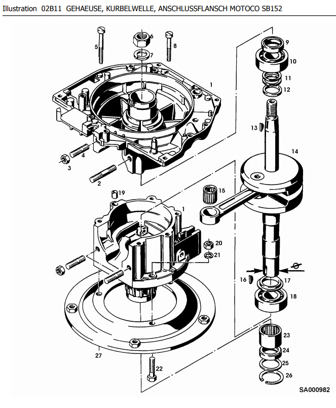 Hier finden Sie alle Ersatzteile von Sabo Motoren Fichtel und Sachs Motor Motoco SB152 EDV-NR.SA20021 Gehäuse, Kurbelwelle, Anschlußflansch Motoco SB152: