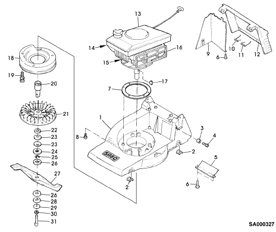 Zeichnung Sabo Rasenmäher Benzin-Rasenmäher 47-2 A TURBOSTAR EDV-NR. SA190 , SERIEN NR (-000405) MIT MOTOR SB140 EDV-NR. SA20019 Gehäuse, Motor, Lüfter, Messerbalken:
