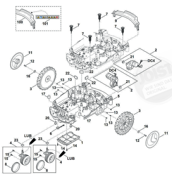 Hier finden Sie alle Ersatzteile von Stihl Mähroboter RMI 632.0 der Zeichnungsgruppe Gehäuseunterteil, Fahrwerk: