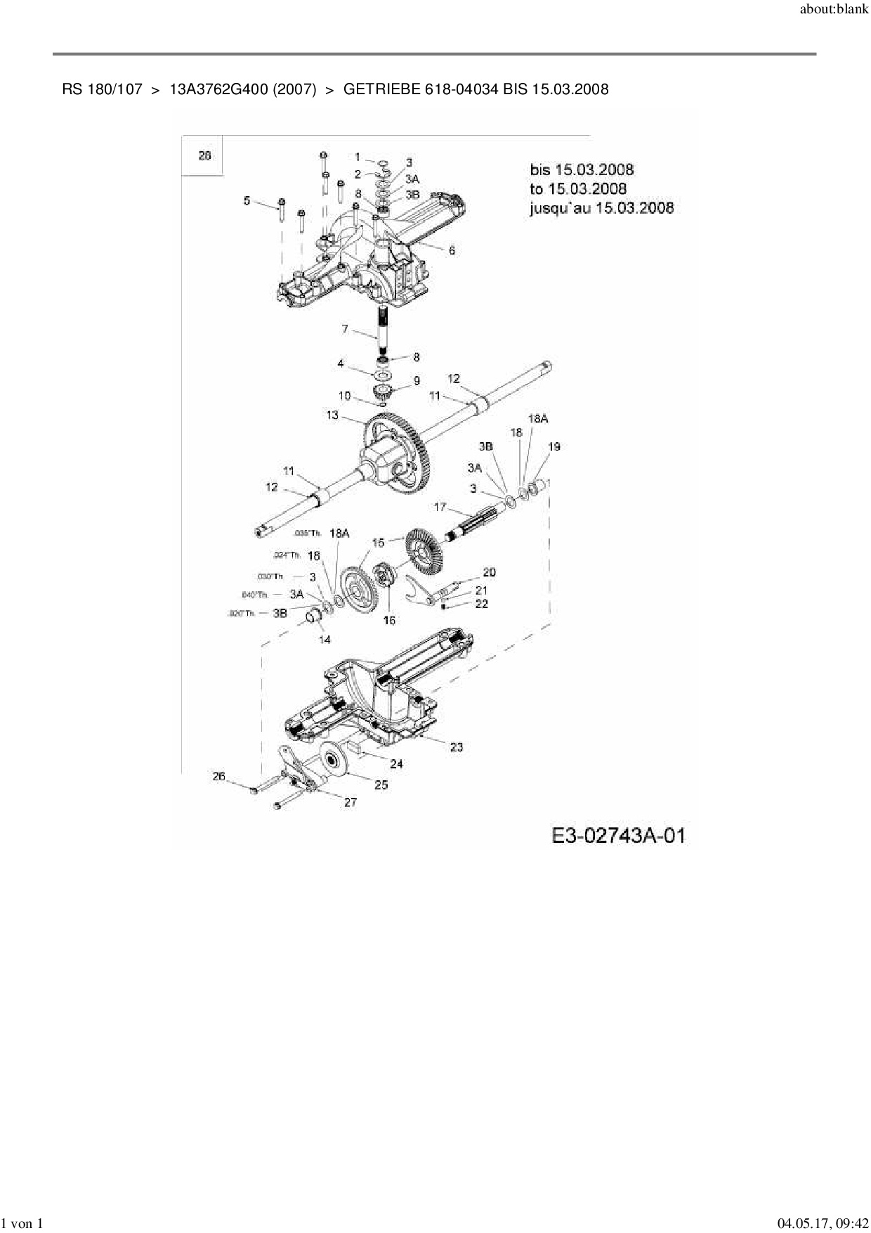 Download Ersatzteil-Zeichnung MTD RS 180/107 Zeichnung Getriebe 618-04034 bis 15.03.2008 (PDF-Format)