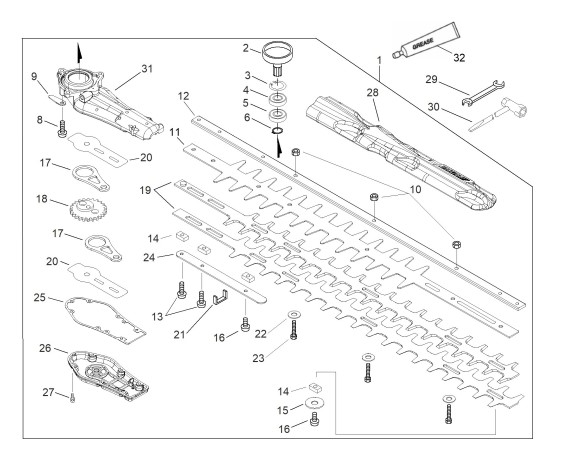 Zeichnung von ECHO Heckenscheren HCR-161ES HCR-161ES von S.-Nr. 36013013 bis 36013152 Getriebe, Messer, Werkzeug: