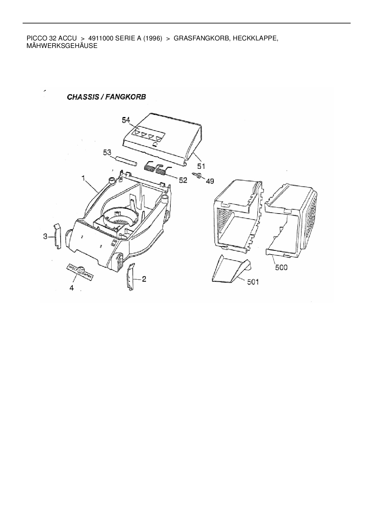 Ersatzteile für Akkumäher Wolf-Garten Picco 32 Accu aus der Zeichnung Grasfangkorb, Heckklappe, Mähwerksgehäuse: