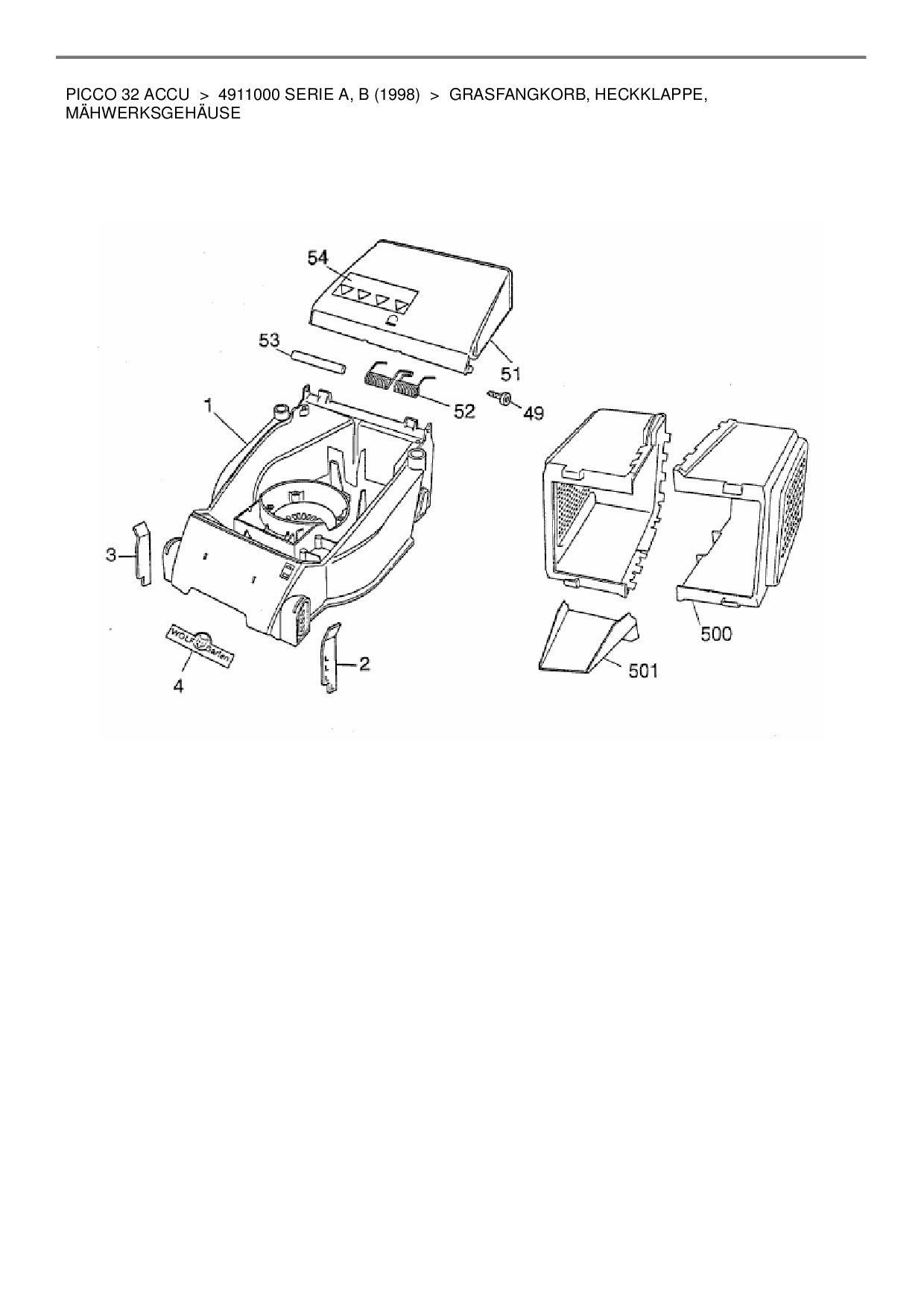 Download Ersatzteil-Zeichnung Wolf-Garten Picco 32 Accu Zeichnung Grasfangkorb, Heckklappe, Mähwerksgehäuse (PDF-Format)