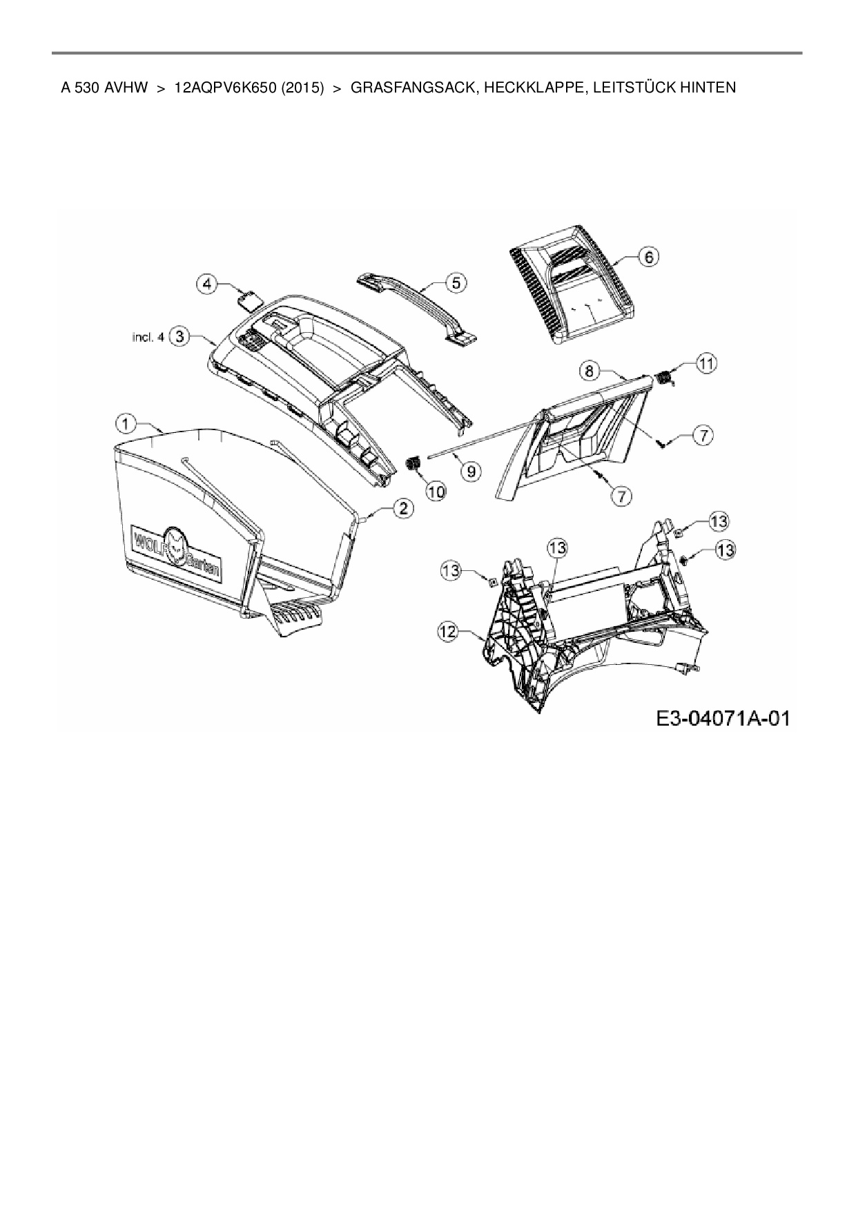 Ersatzteile für Motormäher mit Antrieb Wolf-Garten A 530 AVHW aus der Zeichnung Grasfangsack, Heckklappe, Leitstück hinten: