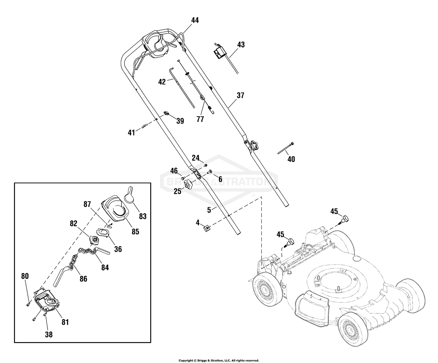 Hier finden Sie alle Ersatzteile von Snapper 12ALC3B3707 - 1696628-00, SP105 21" 775 Series Self Propelled Electric Start Walk Behind Mower der Zeichnungsgruppe Handle Group: