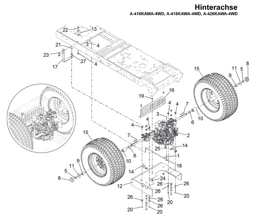 Zeichnung von ECHO-Motorgeräte Rasentraktoren A-Serie A-426KAWA-4WD - 2016-06 A-426KAWA-4WD ab Juni 2016 Hinterachse: