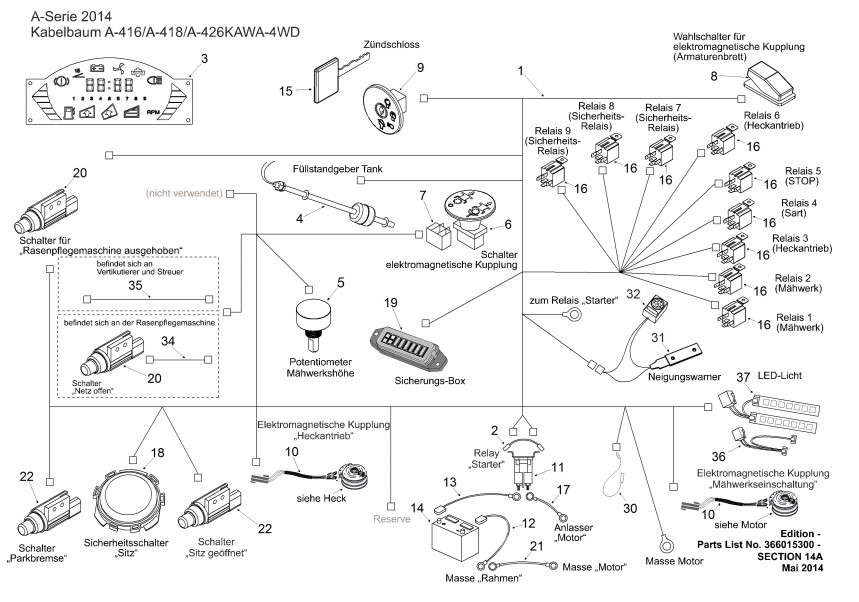 Zeichnung von ECHO-Motorgeräte Rasentraktoren A-Serie A-416KAWA-4WD - E1100104 Kabelbaum KAWA-4WD: