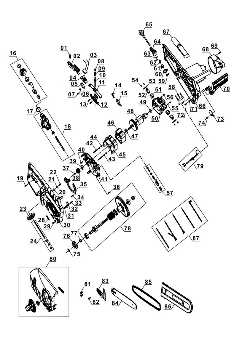 Folgende Ersatzteile für Ozito Kettensäge ECS-406 A, Ex, Aus ( 4501722 11014 ) können Sie hier bestellen: