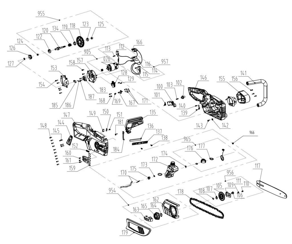 Zeichnung Sollten Sie Fragen zu einem Ersatzteil vom Ozito Kettensäge PXCSS-1825, EX, AUS ( 3001240 ) haben, können Sie uns gerne eine E-Mail (mit einem Foto vom Typenschild Ihres Gerätes) schreiben oder eine Ersatzteilanfrage stellen.