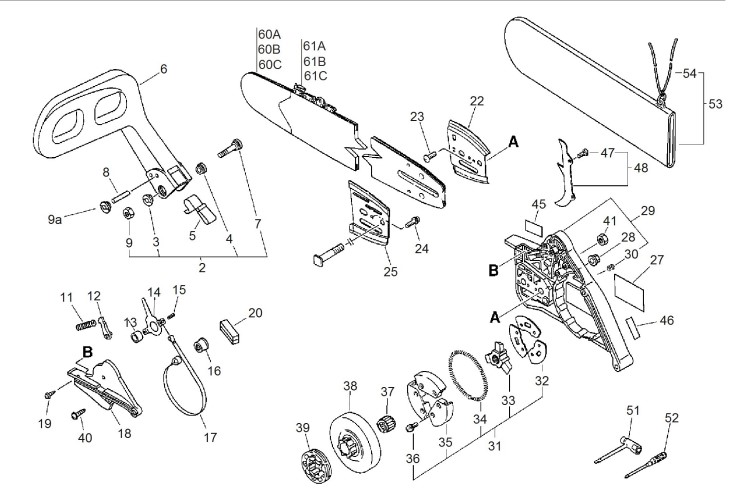 Zeichnung von ECHO Motorsägen CS-6701 CS-6701 ohne Dekompressionsventil Kupplung, Kettenbremse, Schneidgarnitur: