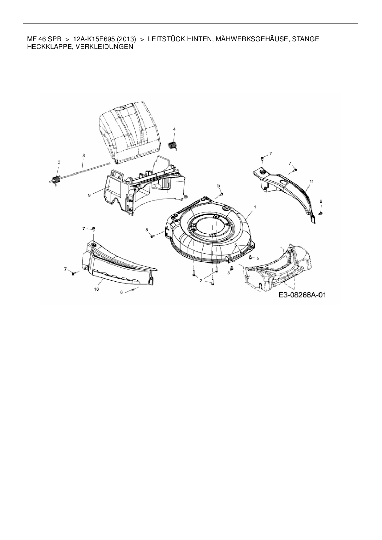 Ersatzteile für Motormäher mit Antrieb Massey Ferguson MF 46 SPB aus der Zeichnung Leitstück hinten, Mähwerksgehäuse, Stange Heckklappe, Verkleidungen: