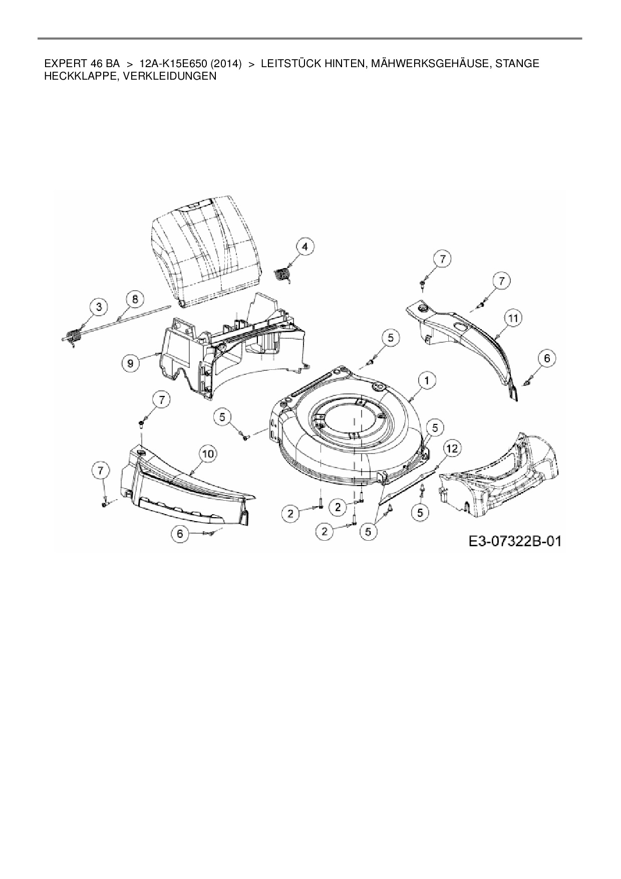 Ersatzteile für Motormäher mit Antrieb Wolf-Garten Expert Expert 46 BA aus der Zeichnung Leitstück hinten, Mähwerksgehäuse, Stange Heckklappe, Verkleidungen: