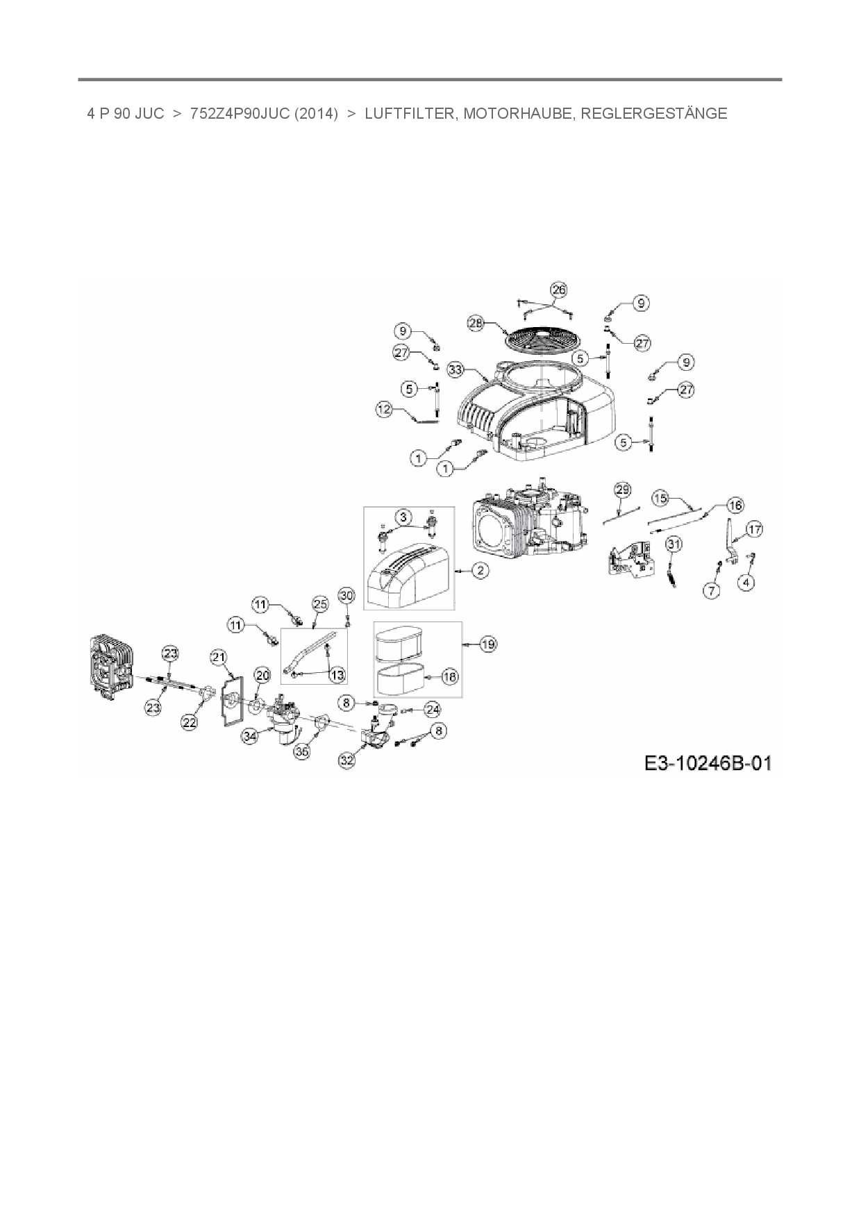 Ersatzteile für Vertikal MTD-Motoren 4 P 90 JUC aus der Zeichnung Luftfilter, Motorhaube, Reglergestänge: