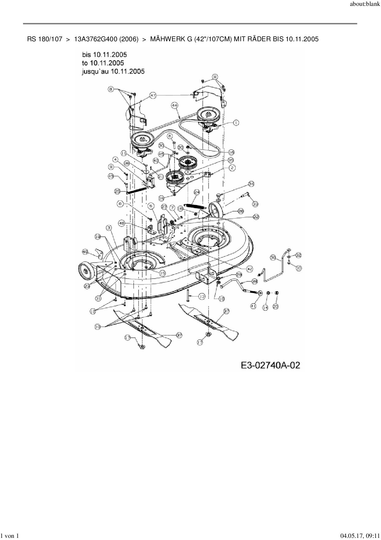 Download Ersatzteil-Zeichnung MTD RS 180/107 Zeichnung Mähwerk G (42"/107cm) mit Räder bis 10.11.2005 (PDF-Format)