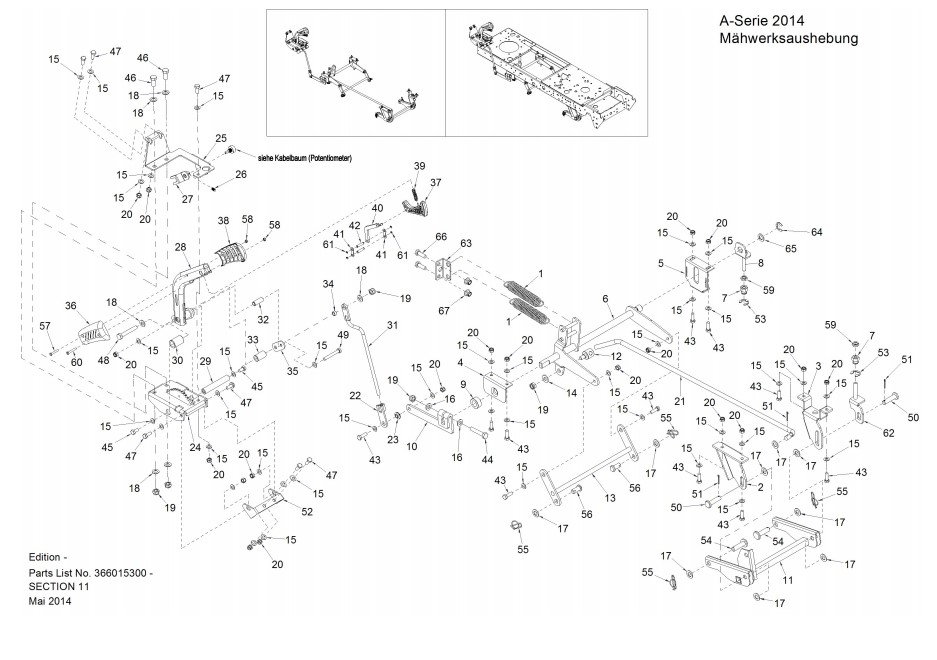 Zeichnung von ECHO-Motorgeräte Rasentraktoren A-Serie A-416KAWA-4WD - E1100104 Mähwerksaushebung bis März 2015: