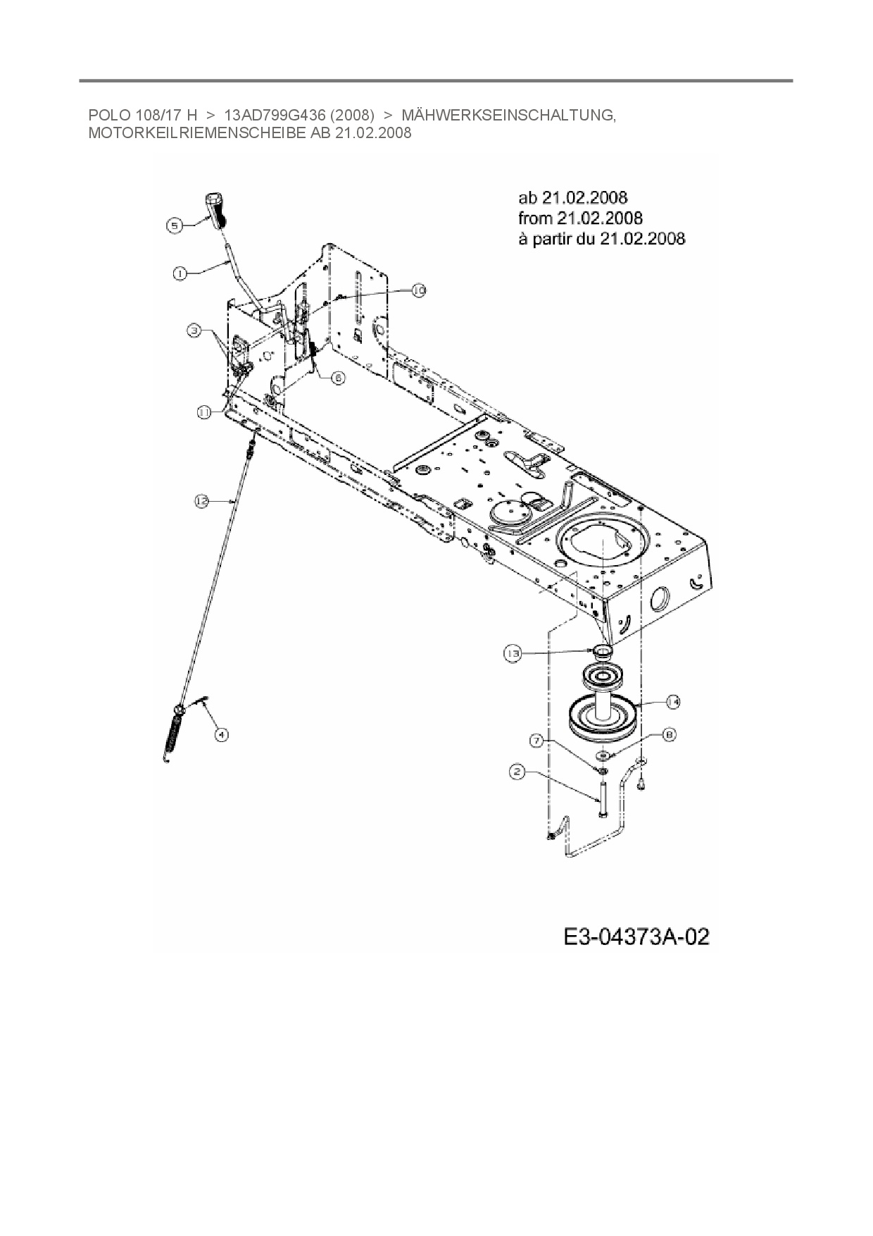Download Ersatzteil-Zeichnung Oleo-Mac Polo 108/17 H Zeichnung Mähwerkseinschaltung, Motorkeilriemenscheibe ab 21.02.2008 (PDF-Format)