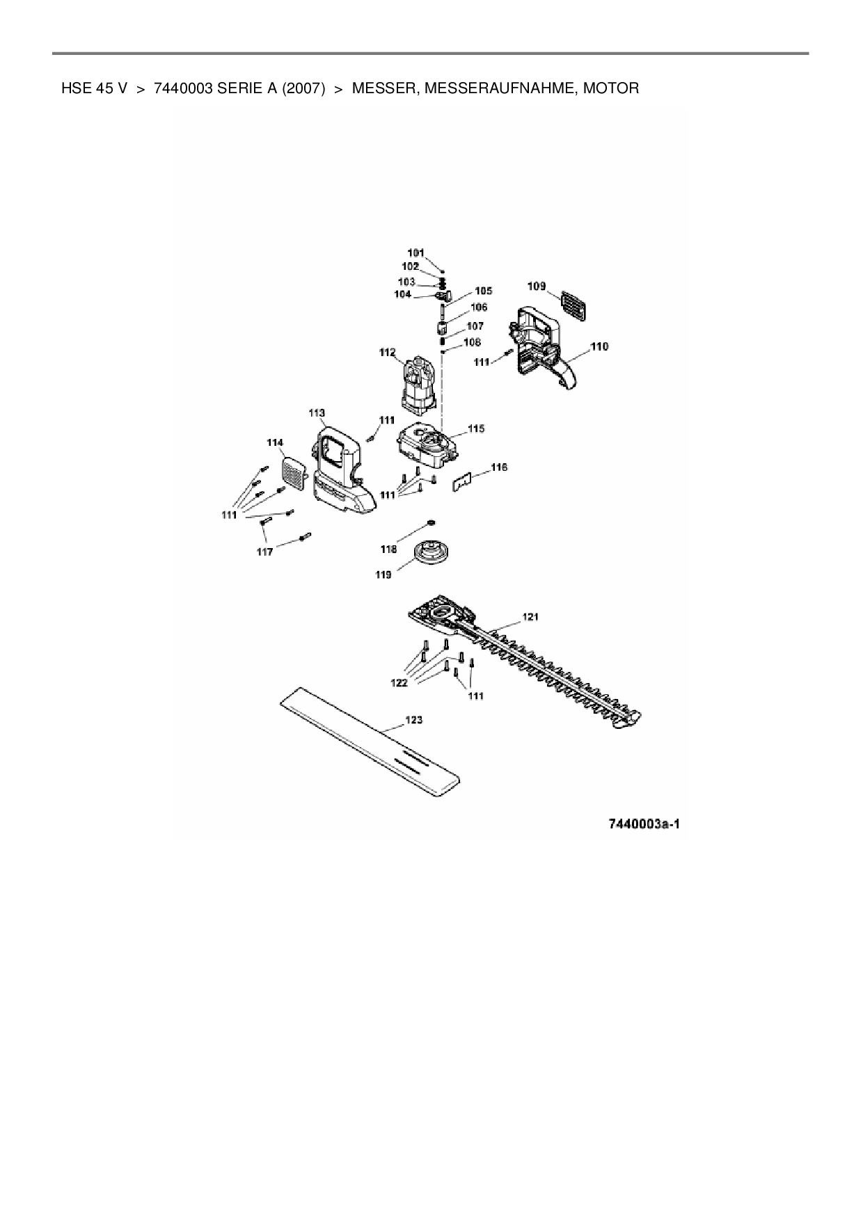 Ersatzteile für Elektroheckenschere Wolf-Garten HSE 45 V aus der Zeichnung Messer, Messeraufnahme, Motor: