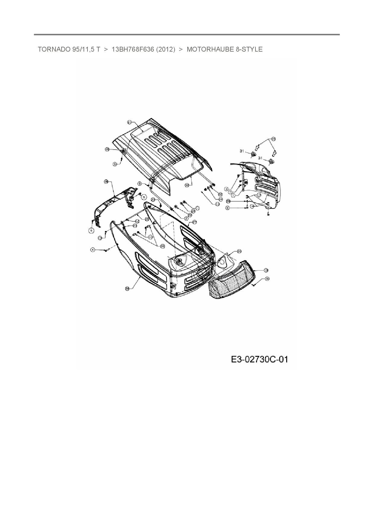 Zeichnung für Oleo-Mac Rasentraktor Tornado 95/11,5 T mit der Geräte-Artikelnr. 13BH768F636 ab Baujahr 2012: